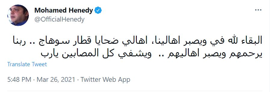 بينما قال نجم الكوميديا محمد هنيدي: “البقاء لله في الموتى ويصبر أهالينا، أهالي ضحايا قطار سوهاج، ربنا يرحمهم ويصبر أهاليهم، ويشفي كل المصابين”.