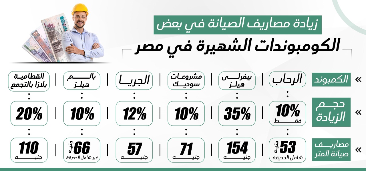 وتأتي في صدارة ترتيب زيادة مصروفات الصيانة مدينة بيفرلي هيلز، حيث كانت مصاريف صيانة المتر ٣٤.٧٦ جنيه في العام الماضي، وارتفعت العام الحالي إلى ٤٦.٨٠ للمتر، بنسبة زيادة 35%، يليها القطامية بلازا التجمع في المرتبة الثانية، والتى وصل حجم زيادة مصاريف الصيانة فيها إلى 20%، بواقع 110 جنيهًا للمتر الواحد بشكل عام، ثم جاء مشروع الجريا في الترتيب الثالث في زيادة مصاريف الصيانة بنسبة 12%، بواقع 57 جنيهًا للمتر الواحد.