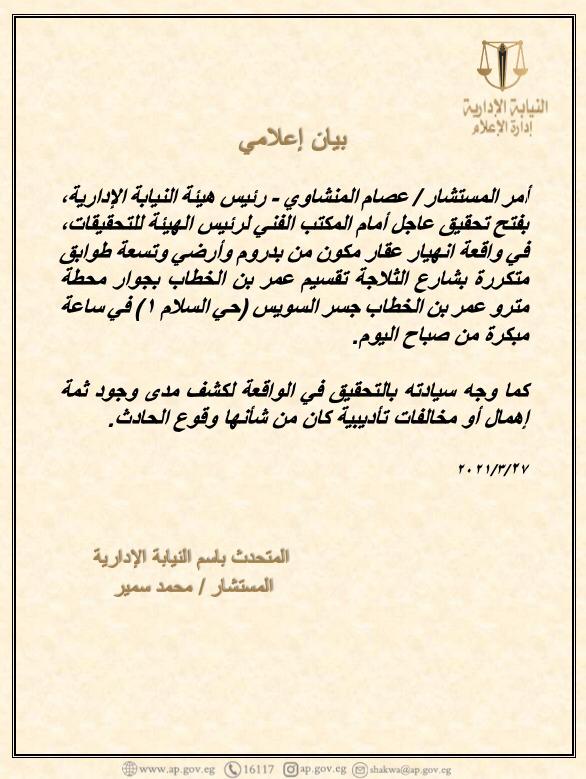 وأمر النائب العام عقب انتقال فريق من النياية العامة، لمعاينة عقار جسر السويس المنهار بشارع ثلاجات منطقة قباء، وذلك بعد انهيار عقار مكون من 11 طابقًا، مع استمرار البحث والتنقيب بواسطة أوناش لرفع الحطام والكتل الخرسانية.