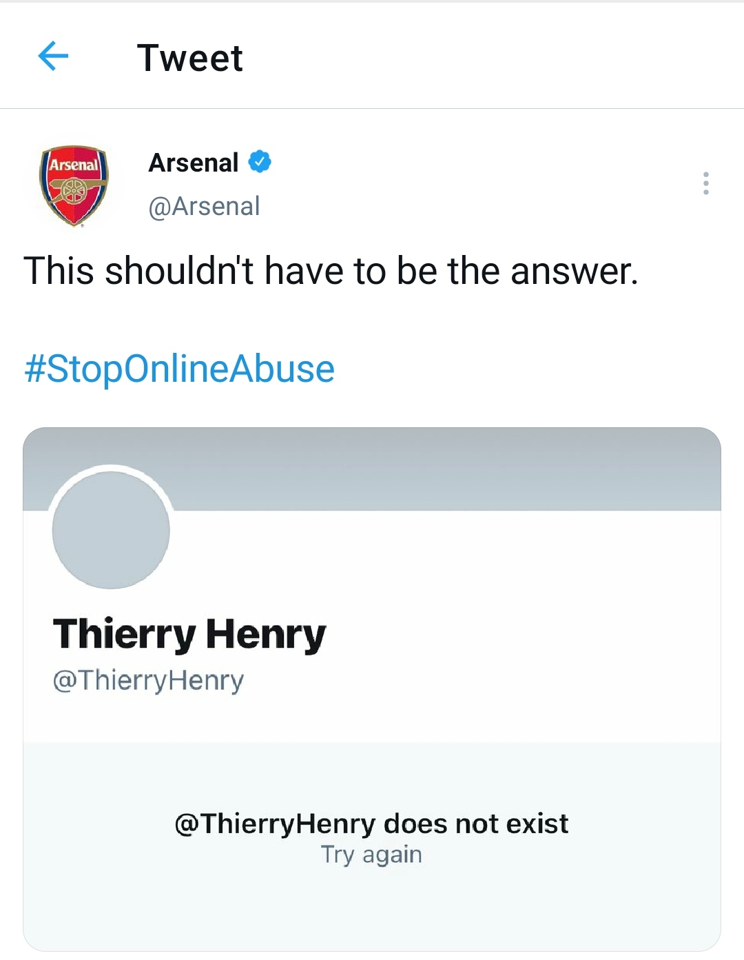 وكتب حساب نادي أرسنال الإنجليزي، ردا على غلق أسطورته تيري هنري حسابه على تويتر: "يجب ألا يكون الرد كذلك".