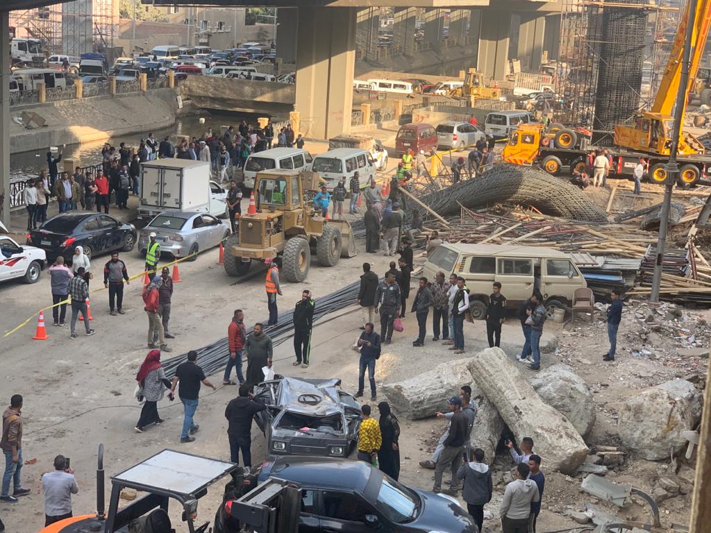 وقال منصور أحمد، حارس عقار، 55 عاما، إننا نتابع منذ فترة كبيرة عمل الشركة على تشييد الكوبري، لكننا فوجئنا في الثالثة عصر اليوم بانهيار أحد الأعمدة ليتساقط على سيارتين.