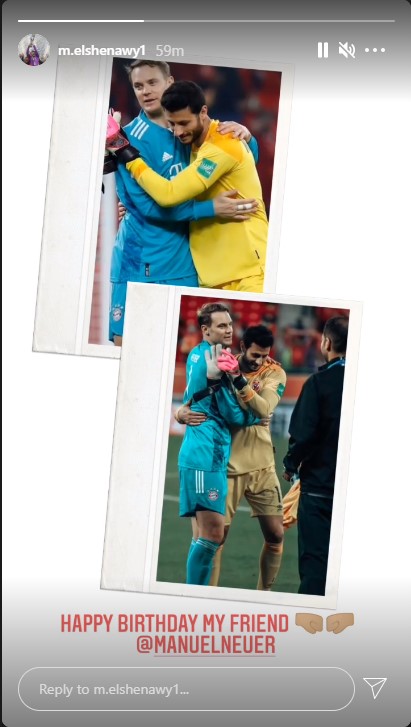 ونشر “الشناوي” صورة له برفقة حارس منتخب ألمانيا، عبر خاصية “ستوري” على موقع التواصل الاجتماعي “إنستجرام”، وكتب عليها: “عيد ميلاد سعيد صديقي مانويل نوير”.
