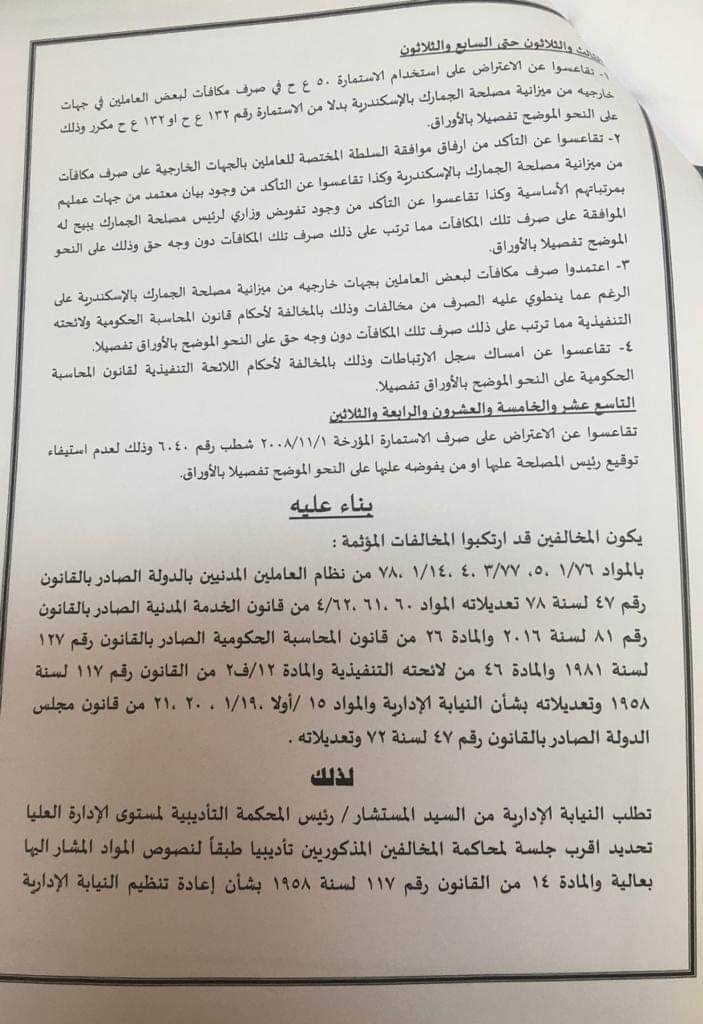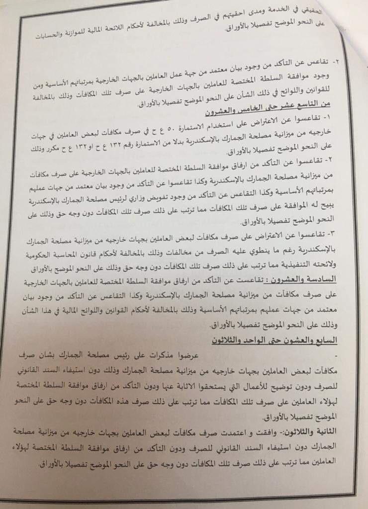 وتقاعسوا عن التأكد من ارفاق موافقة السلطة المختصة للعاملين بالجهات الخارجية علي صرف المكأفات من جمارك الاسكندرية، أو وجود بيان معتمد من جهات عملهم بمرتباتهم،ولم يتأكدوا من وجود تفويض وزارى لرئيس جمارك الأسكندرية يبيح له صرف المكأفات، ولم يعترضوا علي الصرف للعاملين بجهات خارجية مما ترتب علي ذلك صرف تلك المكافأت دون وجه حق.