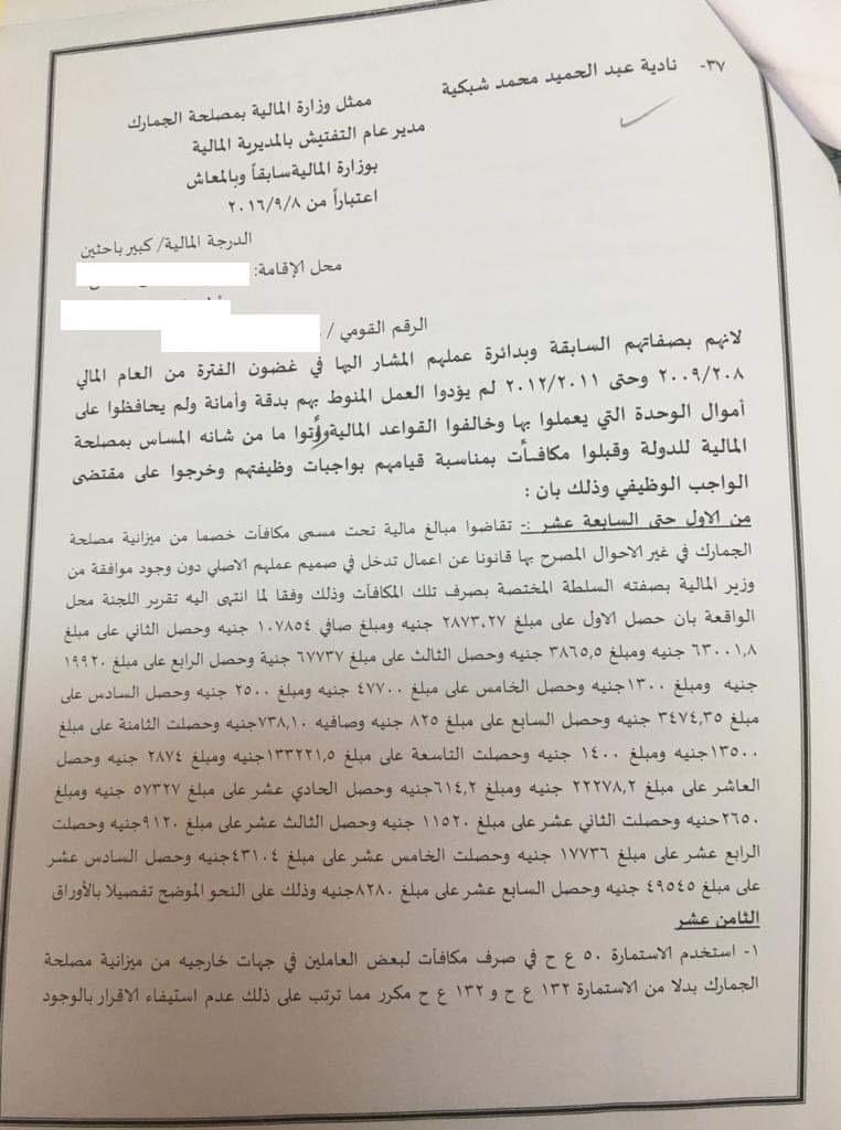 وكشفت التحقيقات أن المحالين من الأول حتى السابعة عشر، تقاضوا مبالغ مالية تحت مسمى مكافأت من ميزانية مصلحة الجمارك فى غير الأحوال المصرح بها قانوناً عن أعمال تدخل فى صميم عملهم الأصلى دون وجود موافقة من وزير المالية وفقاً لما إنتهى إليه تقرير اللجنة.