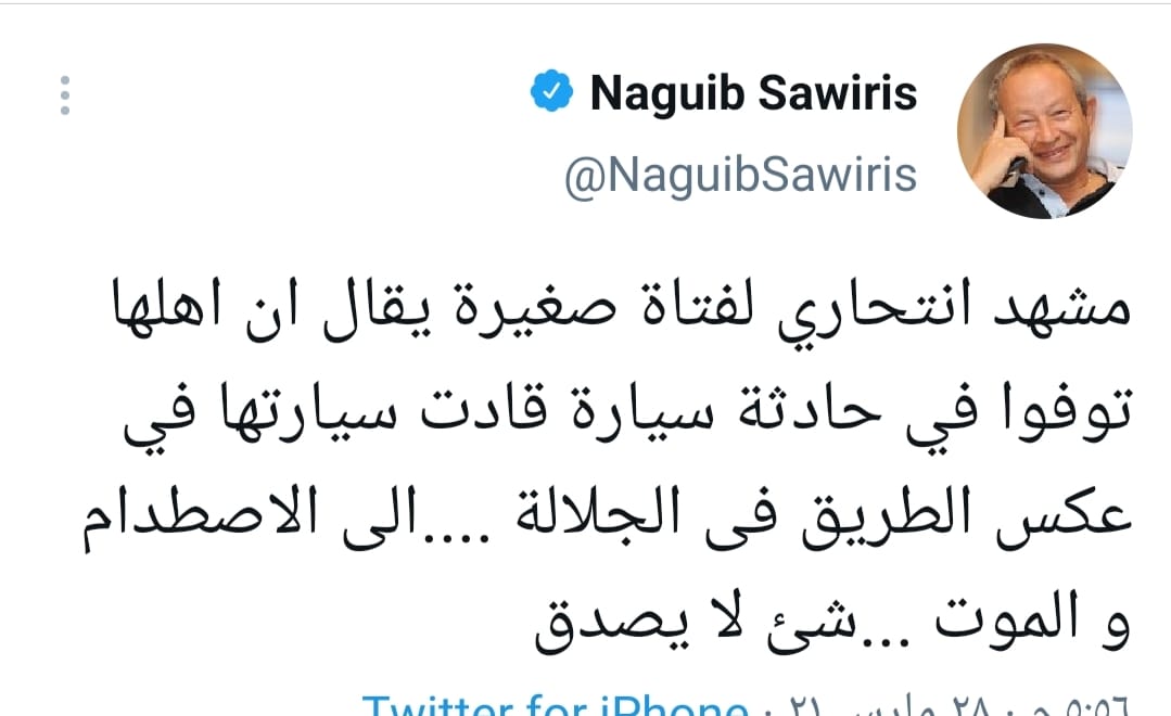 وقال ساويرس، “مشهد انتحاري لفتاة صغيرة يقال إن أهلها توفوا في حادثة سيارة، فقامت بقيادة سيارتها إلى الاصطدام والموت”، مضيفًا “شيء لا يصدق”.