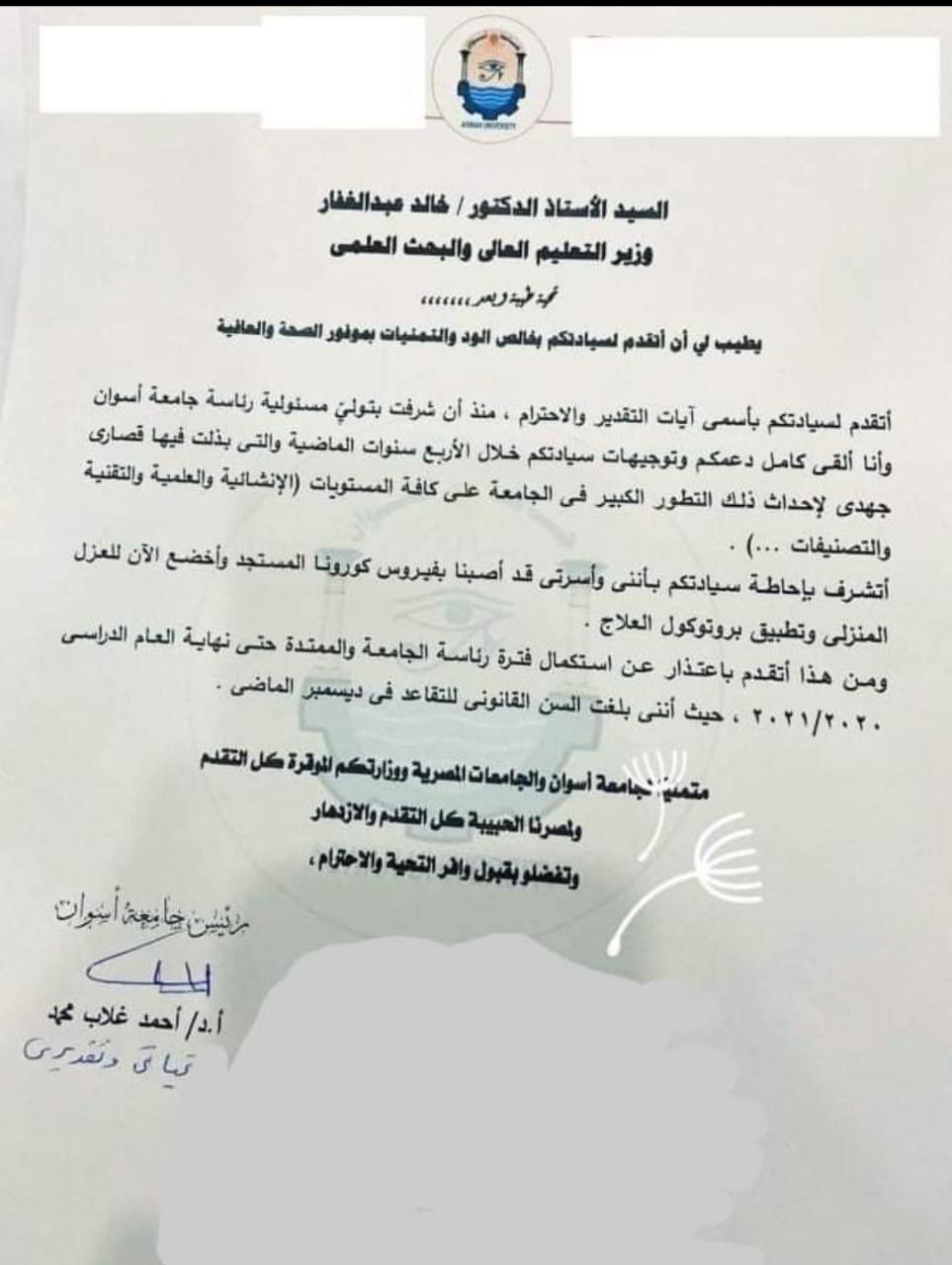 رئيس جامعة أسوان يعتذر عن استكمال فترة رئاسة الجامعة: "بلغت السن القانونية للتقاعد" (مستندات)