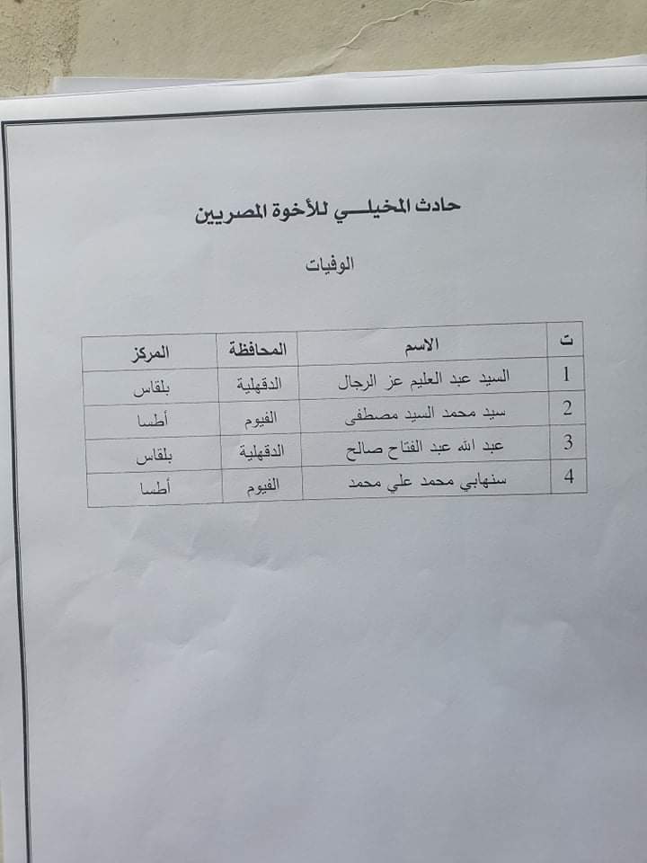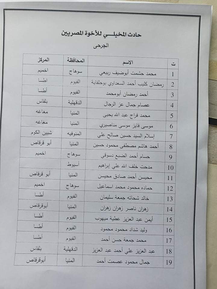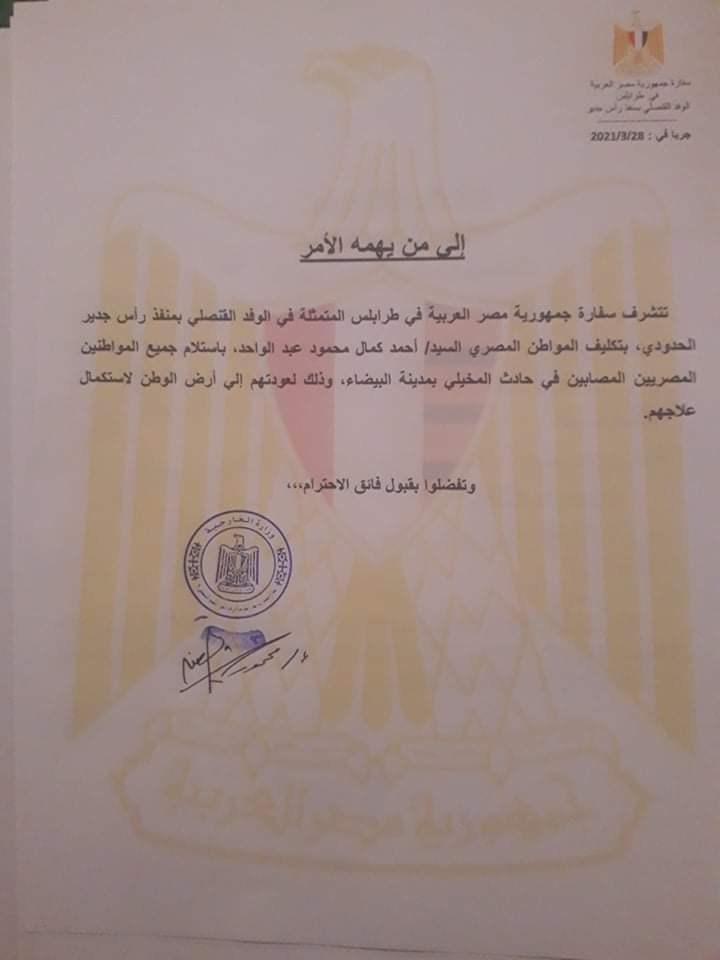 وفي سياق متصل، كلفت سفارة مصر في طرابلس أحمد كمال رئيس الجالية المصرية في ليبيا، بتسلم جميع المواطنين المصريين المصابين في حادث المخيلي بمدينة البيضاء، وذلك لعودتهم إلى أرض الوطن لاستكمال علاجهم.