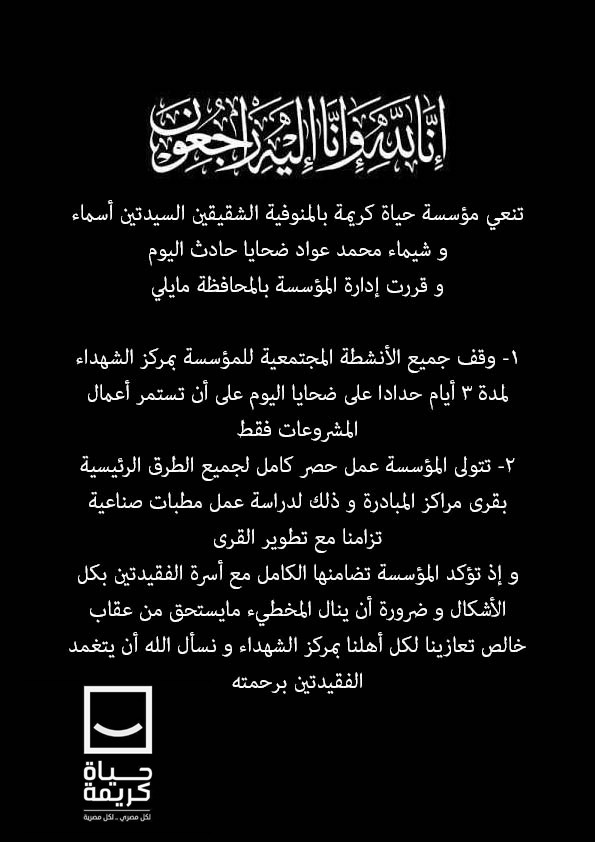 وأكد المهندس محمد ربيع، منسق حياة كريمة بالمنوفية، خلال بيان، على تقديم التعازي لأسرة الضحيتان، معلنًا الحداد على أرواحهما، ووقف الأنشطة المجتمعية لمدة 3 أيام، على أن تستمر فقط أعمال المشروعات.