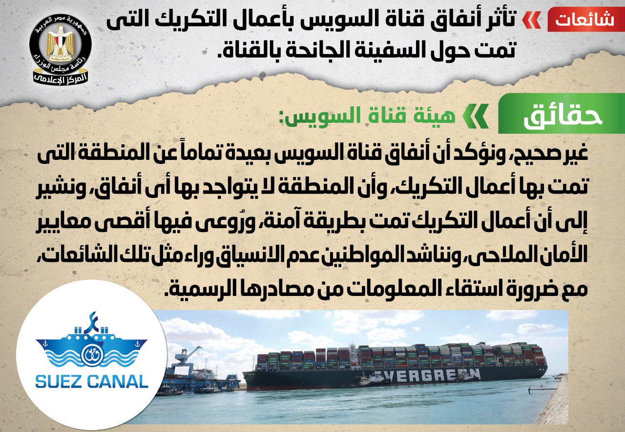 وقال المركز الإعلامي لمجلس الوزراء إنه تواصل مع هيئة قناة السويس، والتي نفت تلك الأنباء، مُؤكدةً أنه لا صحة لتأثر أنفاق قناة السويس بأعمال التكريك التي تمت حول السفينة الجانحة بالقناة، مُوضحةً أن أنفاق قناة السويس بعيدة تماماً عن المنطقة التي تمت بها أعمال التكريك، وأن المنطقة لا يتواجد بها أي أنفاق، مُشيرةً إلى أن أعمال التكريك تمت بطريقة آمنة، وروعي فيها أقصى معايير الأمان الملاحي، مُناشدةً المواطنين عدم الانسياق وراء مثل تلك الشائعات، مع ضرورة استقاء المعلومات من مصادرها الرسمية.