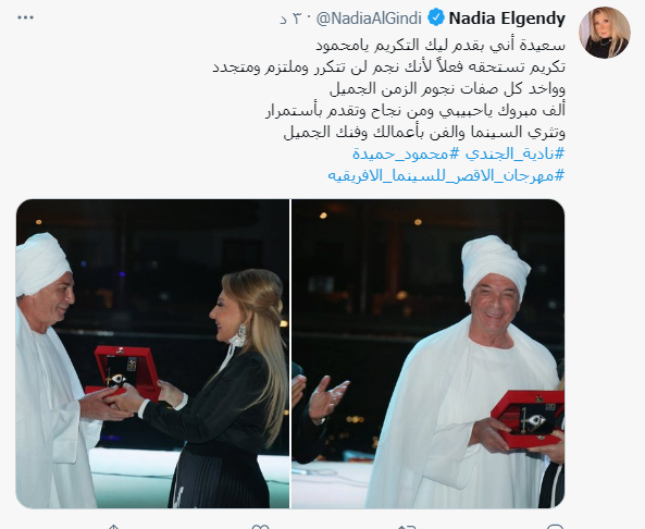 ونشرت الجندي صور عبر صفحتها الرسمية بموقع التغريدات القصيرة "تويتر"، مغردةً: "سعيدة أني بقدم ليك التكريم يامحمود، تكريم تستحقه فعلاً لأنك نجم لن تتكرر".