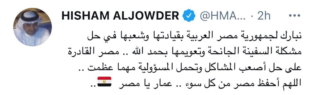 وقال سفير البحرين في تغريدة عبر حسابه الرسمى بتويتر: "نبارك لجمهورية مصر العربية بقيادتها وشعبها في حل مشكلة السفينة الجانحة وتعويمها بحمد الله.. مصر القادرة علة حل أصعب المشاكل وتحمل المسؤولية مهما عظمت.. اللهم احفظ مصر من كل سوء.. عمار يا مصر".