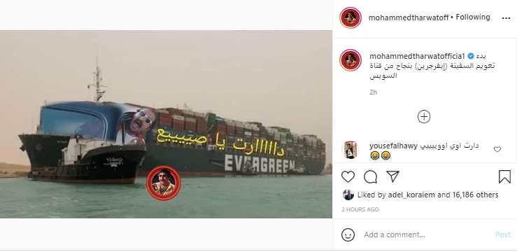 ونشر ثروت، صورة ساخرة مركبة مكتوب عليها “دارات يا صيع”، عبر حسابه الشخصي بموقع تبادل الصور والفيديوهات القصيرة “انستجرام”، وعلق على الصورة قائلًا: "بدء تعويم السفينة إيفر جرين بنجاح من قناة السويس".