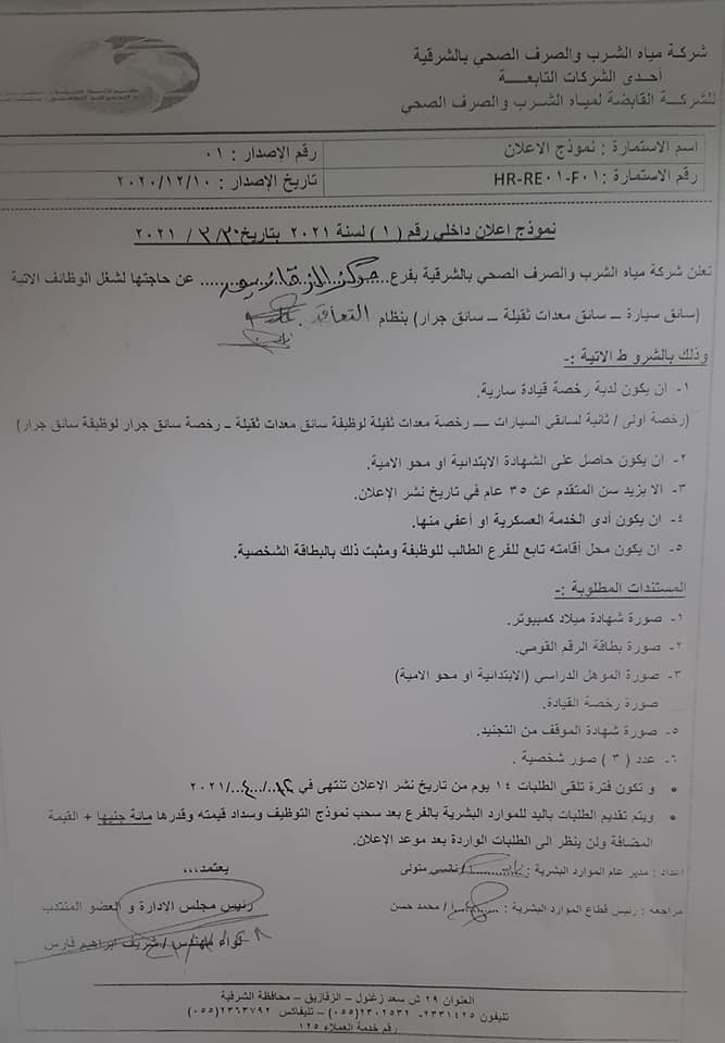 أعلنت شركة مياه الشرب والصرف الصحي بمحافظة الشرقية، برئاسة وإشراف المهندس شريف فارس، رئيس مجلس الإدارة والعضو المنتدب للشركة، عن حاجتها لعدد من الوظائف، جميعها لسائقين، وذلك بعدد من فروع الشركة بنطاق المحافظة.