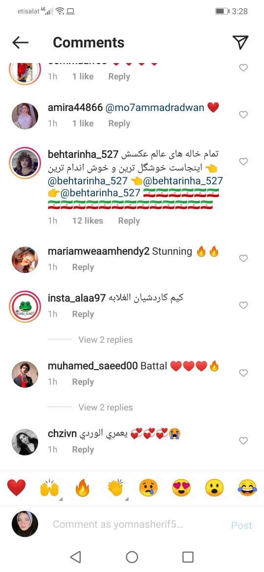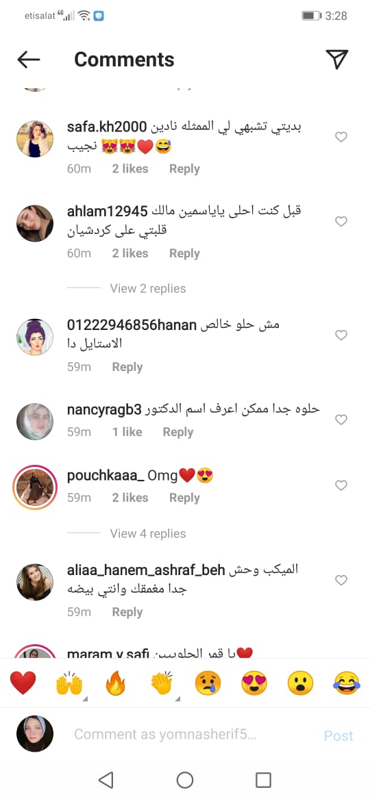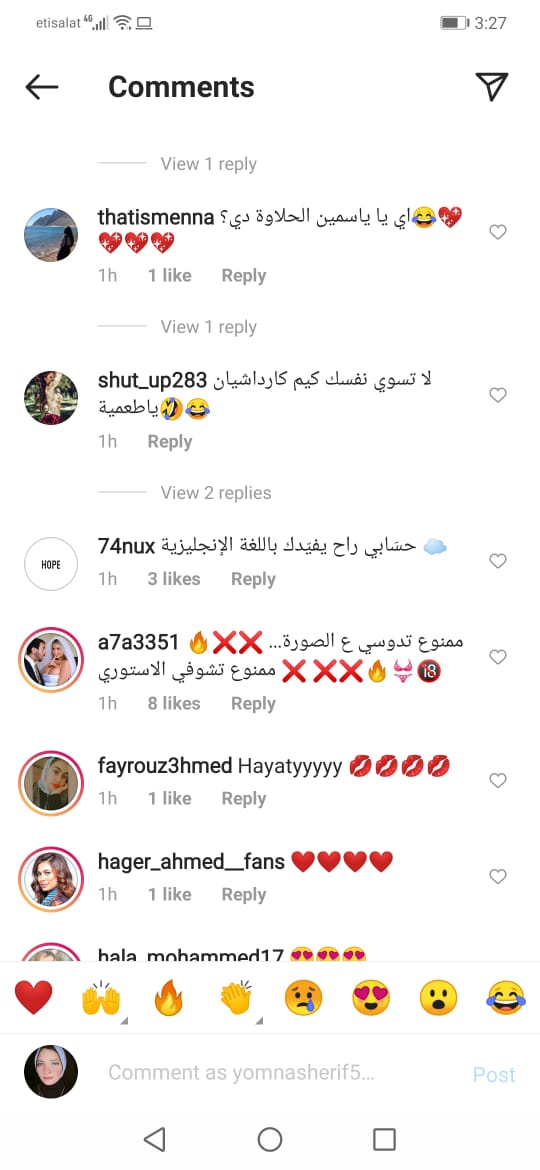 فكتب لها أحد متابعيها: “كيم كاردشيان الغلابة”، وآخر:"لا تسوي نفسك كيم كاردشيان"، بينما انتقدها البعض من متابعيها، حيث جاءت تعليقات مثل: "كنتى أحلى قبل كده، الاستايل مش حلو".