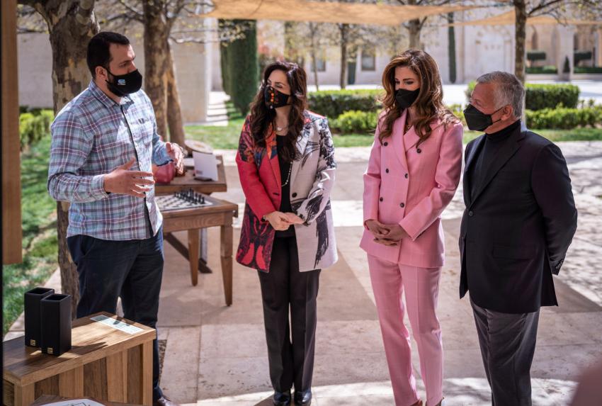 تفقد العاهل الأردني الملك عبد الله الثاني، وقرينته الملكة رانيا، منتجات عدد من الشباب والشابات أصحاب المشاريع الحرفية الصغيرة في مختلف المحافظات، بعد تلقيهم التدريب اللازم، من خلال مبادرة "شباب منتج" التي أطلقها الديوان الملكي الهاشمي عام 2019 بتوجيهات ملكية، بناءً على لقاءات جلالته مع شباب من مختلف المحافظات، لمساعدتهم على تطوير منتجاتهم وأفكارهم الريادية وتحويل مواهبهم إلى مشاريع ناجحة.