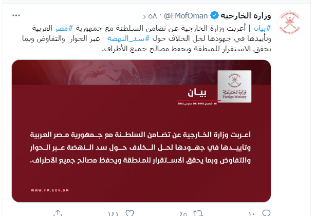 وأعربت الخارجية العمانية عن تضامن السلطنة مع جمهورية مصر العربية وتأييدها في جهودها لحل الخلاف حول سد النهضة عبر الحوار والتفاوض، وبما يحقق الاستقرار للمنطقة ويحفظ مصالح جميع الأطراف.