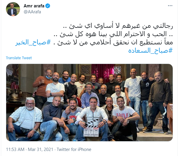 ونشر عرفة الصورة عبر صفحته الرسمية بموقع التغريدات القصيرة "تويتر"، مغردًا: "رجالتي من غيرهم لا أساوي اي شئ.. الحب والاحترام اللي بينا هوه كل شئ .. معًا نستطيع أن نحقق أحلامي من لا شئ".