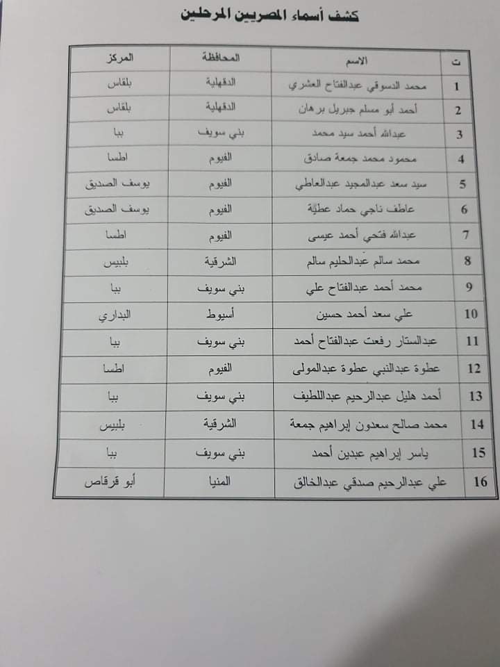 وحصل "القاهرة 24"، على كشف أسماء المصريين المرحلين، والبالغ عددهم نحو 16 مواطنًا مصريًا، من محافظات الفيوم والدقهلية وبني سويف والمنيا.