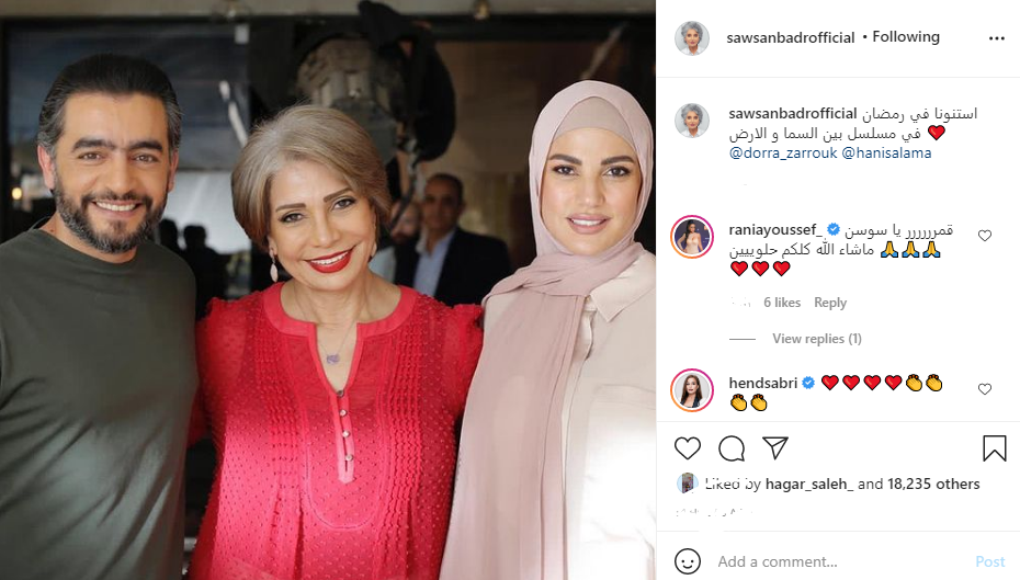 ونشرت سوسن صورة، عبر صفحتها الرسمية بموقع تبادل الصور والفيديوهات "انستجرام"، معلقةً: "استنونا في رمضان في مسلسل بين السما والأرض"، وظهرت في المسلسل الفنانة درة بالحجاب والفنان عمرو سلامة.