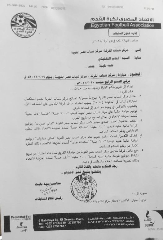 وقرر الاتحاد فرض عقوبات بالجملة على شباب نصر النوبة بعد واقعة الاعتداء على الحكم خلال لقاء الفريق على شباب القرنة، إذ تقرر اعتبار فريق مركز شباب نصر النوبة مهزوما 0/3 أمام شباب القرنة لعدم استكمال المباراة وإنهائها في الدقيقة 45، بعد اعتداء عامل غرف الملابس على المساعد الأول بالضرب بالبوكس في وجهه، مما أدى فقدانه الوعي، حسب ما ذكر قرار الاتحاد.