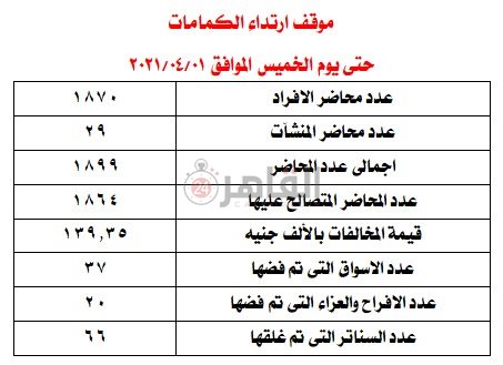 وتم تحرير 1899 محضر عدم ارتداء الكمامة بواقع 1870 محضرًا ضد أفراد و29 ضد منشآت وبلغ إجمالى عدد المحاضر التى تم التصالح مع المخالفين لقرار ارتداء الكمامة 1864 بقيمة إجمالية 139.35 ألف جنيه.