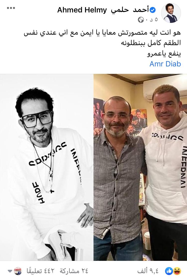 ونشر حلمي، صورة له مركبة مع صورة الهضبة وأيمن بهجت قمر، عبر حسابه الشخصي بموقع التواصل الاجتماعي “فيس بوك"، وعلق عليها قائلًا: "هو انت ليه ماتصورتش معايا يا أيمن مع أني عندي نفس الطقم كامل ببنطلونه ينفع يا عمرو".