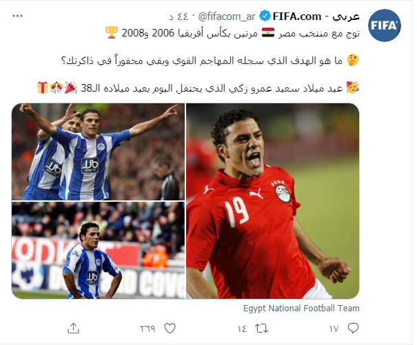 وكتب الحساب الرسمي لفيفا عبر موقع التواصل الاجتماعي تويتر: "توج مع منتخب مصر مرتين بكأس إفريقيا 2006 و2008 ما هو الهدف الذي سجله المهاجم القوي وبقي محفورًا في ذاكرتك؟ عيد ميلاد سعيد عمرو زكي الذي يحتفل اليوم بعيد ميلاده الـ38.