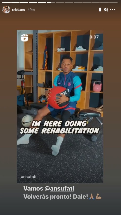 وحرص رونالدو على توجيه الدعم المعنوي لفاتي، الذي يعاني من الإصابة على مستوى الركبة خلال الفترة الأخيرة.
