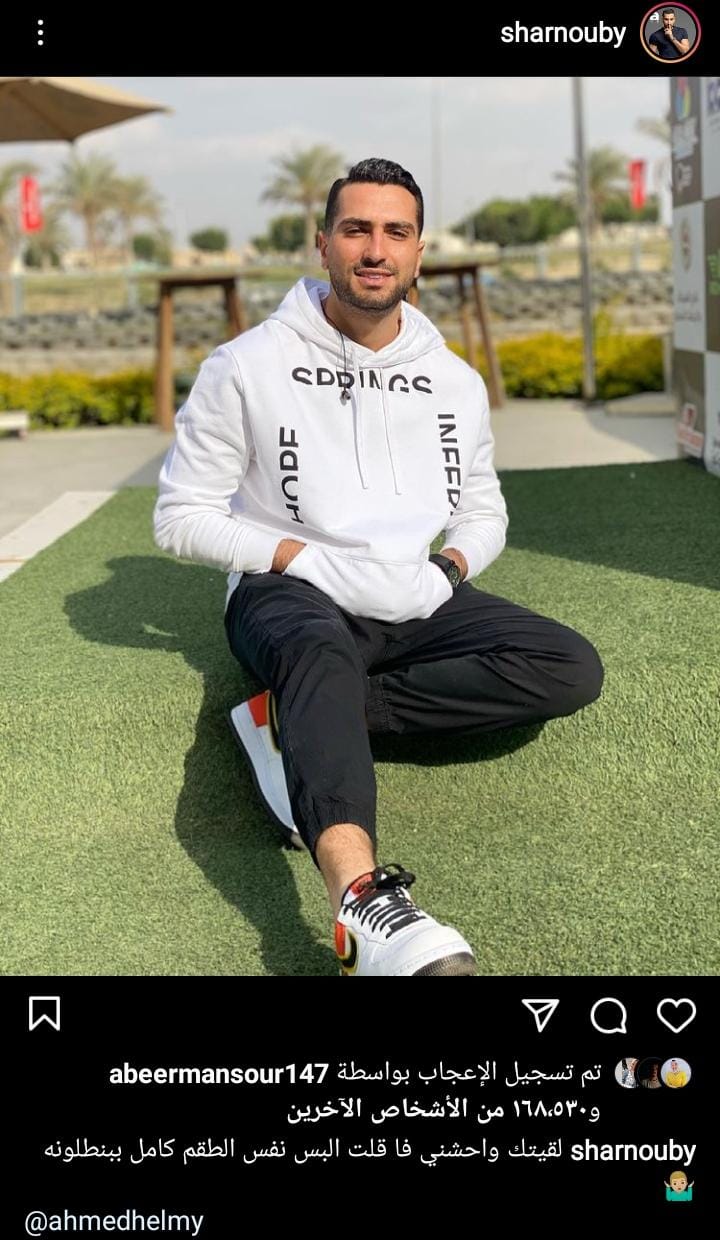 وشارك محمد الشرنوبي صورته بـ"السويت شيرت"، عبر حسابه الرسمي بموقع الصور والفيديوهات القصيرة "انستجرام"، وعلق قائلا: "لقيتك واحشني، قلت ألبس نفس الطقم كامل ببنطلونه".