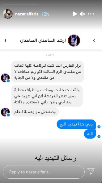وعلق نزار على هذه التهديدات، قائلًا: "هذا مو تحريض على القتل، لو اني غلطان صدك چذب، معقوله وصلنه الهل مرحله، مو المفروض الحكومه تعاقب على هيج تصرف، لو اني غلطان ليش تحريض على القتل، مو كافي خراب.. ودمار حسبنا الله ونعم الوكيل".