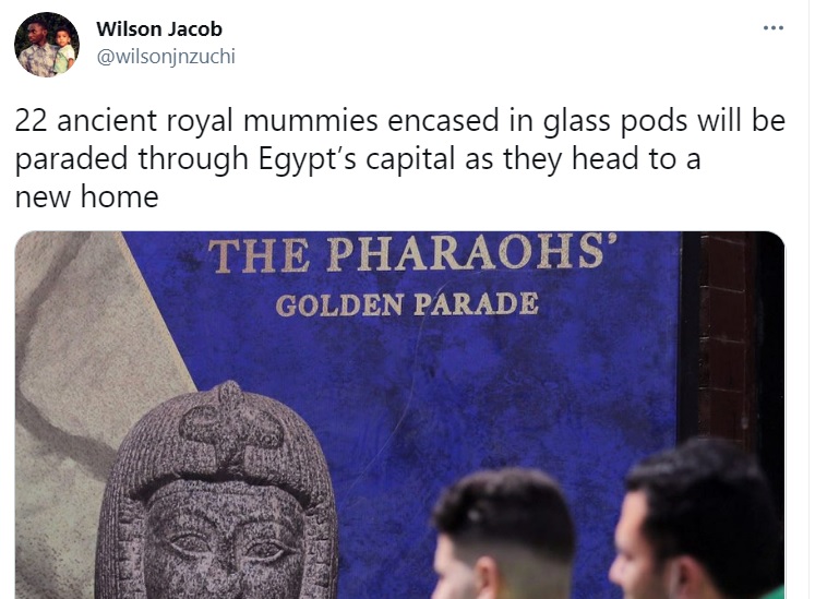كتب "وليسون جاكوب": سيتم عرض 22 مومياء ملكية قديمة، مغطاة بأكواب زجاجية في العاصمة المصرية أثناء توجههم إلى منزل جديد".