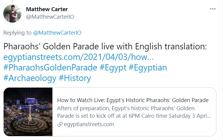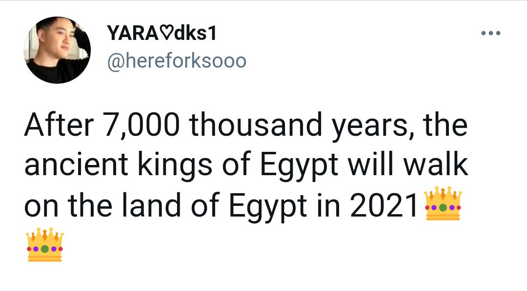 بالإضافة إلى كتب حساب أخر:" بعد 7000 ألف سنة ، سيمشي ملوك مصر القدماء على أرض مصر في عام 2021".