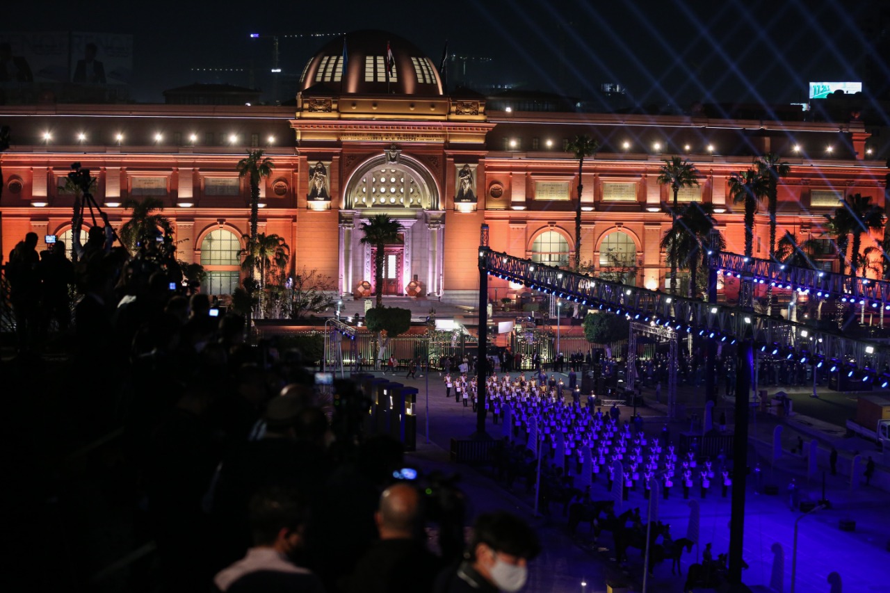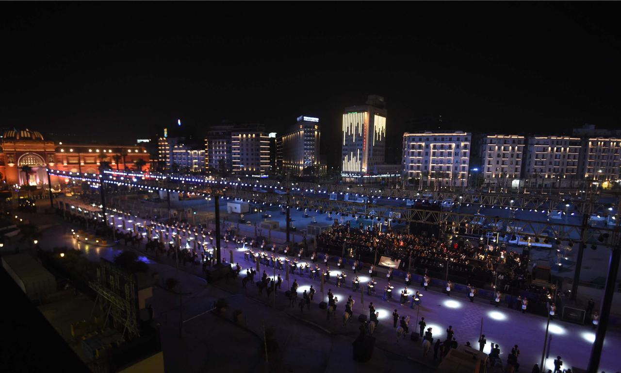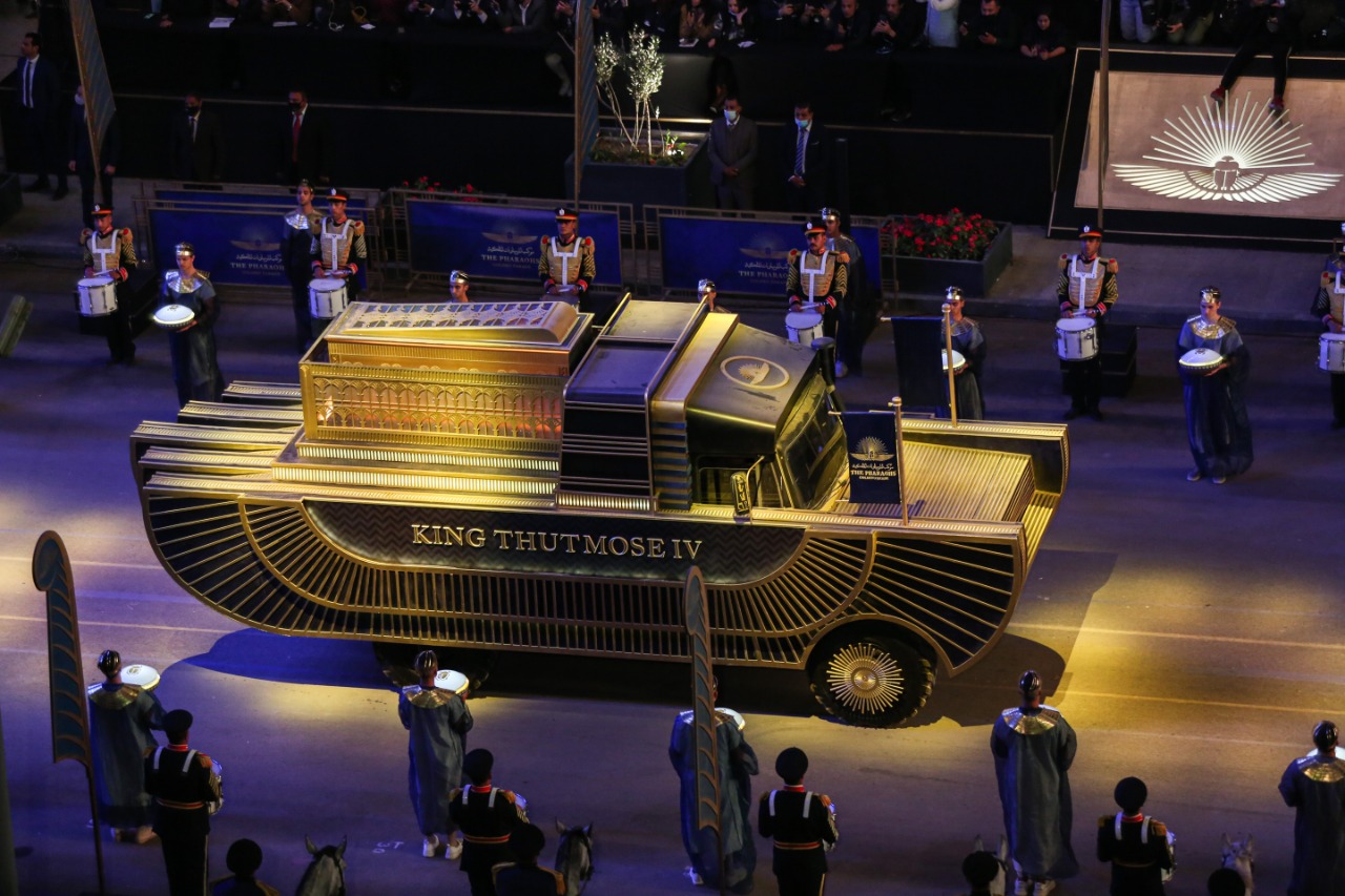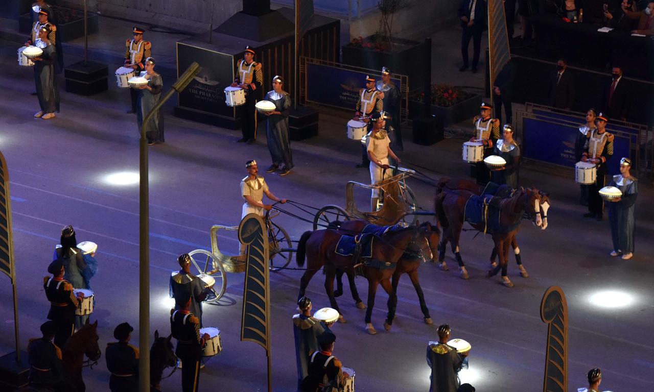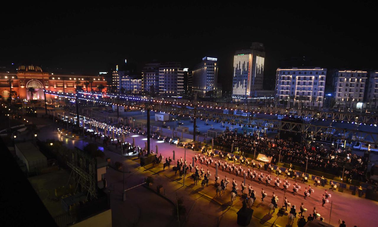 استدعت مصر بعضا من عراقة التاريخ واكتست ليلتها أمس بأجواء حضارتها القديمة، وكانت شرارة البداية من داخل المتحف المصري بالتحرير حيث يرقد حكامها القدماء، واستبق الموكب الملكي مراسم فرعونية مثل عربات الخيول الحربيةن تبعه خروج 22 عربة تحمل المومياوات، واحدة تلو الأخرى، وتم ترتيب الملوك والملكات في الموكب وفقا لترتيبهم الزمني.