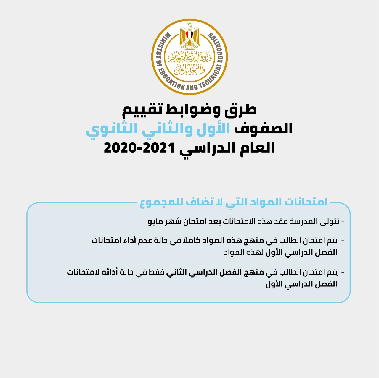 - امتحانات المواد التي لا تضاف للمجموع تتولى المدرسة عقدها وذلك بعد امتحانات شهر مايو على مستوى المدرسة وتحت إشراف الإدارة التعليمية، والطلاب الذين لم يسبق لهم أداء هذه الامتحانات قبل توقف الدراسة يتم امتحانهم في المنهج كاملاً، أما الطلاب الذين سبق لهم أداء هذه الامتحانات قبل توقف الدراسة يتم امتحانهم في منهج ومقرر الصف الفصل الدراسي الثاني فقط.