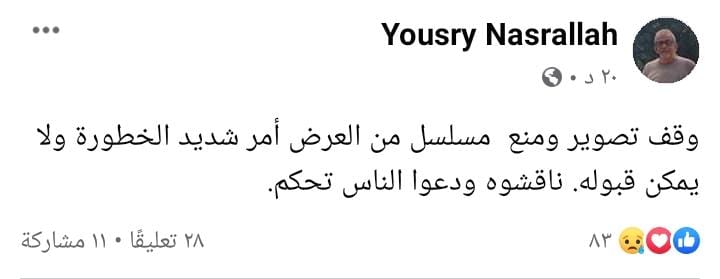 وكتب "نصر الله" منشورًا عبر حسابه الشخصي بموقع التواصل الاجتماعي “فيس بوك”، وقال:"وقف تصوير ومنع مسلسل من العرض أمر شديد الخطورة ولا يمكن قبوله.. ناقشوه ودعوا الناس تحكم".