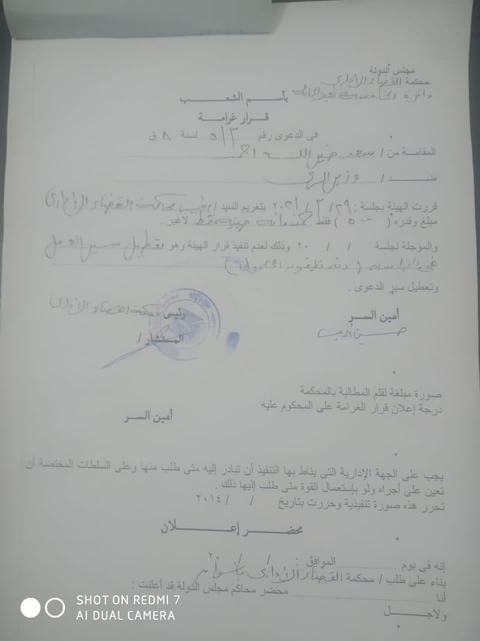 لأول مرة في تاريخ القضاء.. قاضٍ بمجلس الدولة يغرم نفسه على المنصة لتعطيله سير الجلسة (مستند)