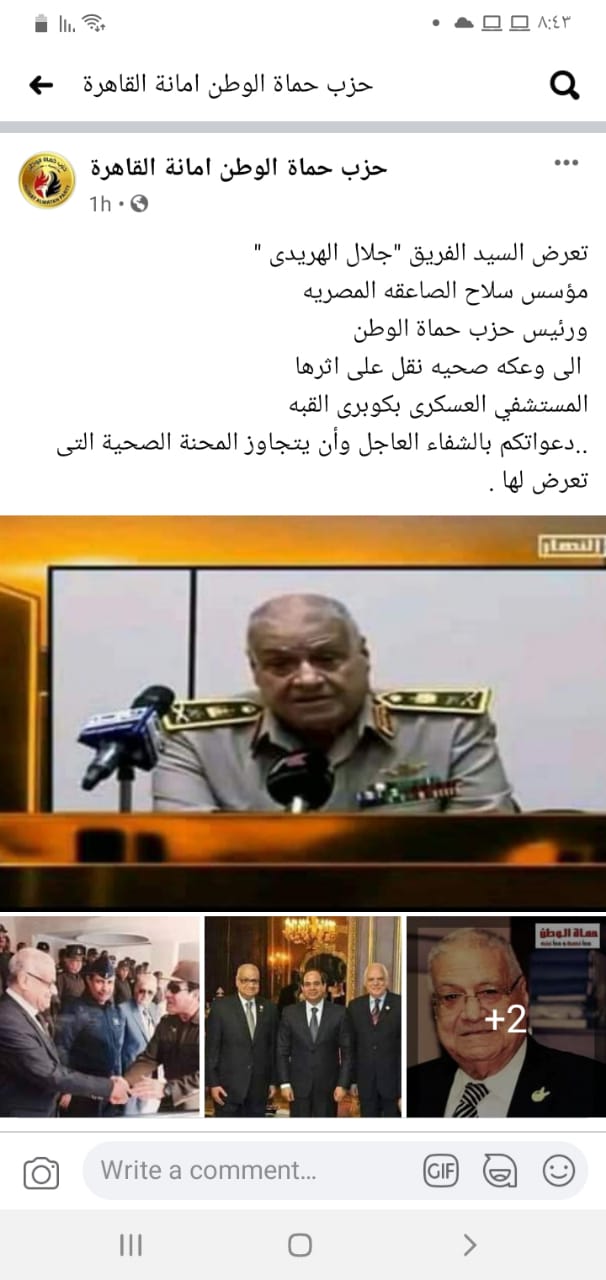 نقل الفريق جلال هريدي رئيس حزب حماة الوطن إلى المستشفى العسكري