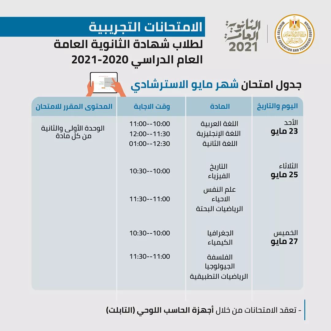 أعلنت وزارة التربية والتعليم والتعليم الفني، عن تفاصيل الامتحانات التجريبية المقررة على طلاب الثانوية العامة، والمقرر انعقادها في أشهر أبريل ومايو ويونيو، وذلك قبل امتحان نهاية العام للعام الدراسي 2020-2021