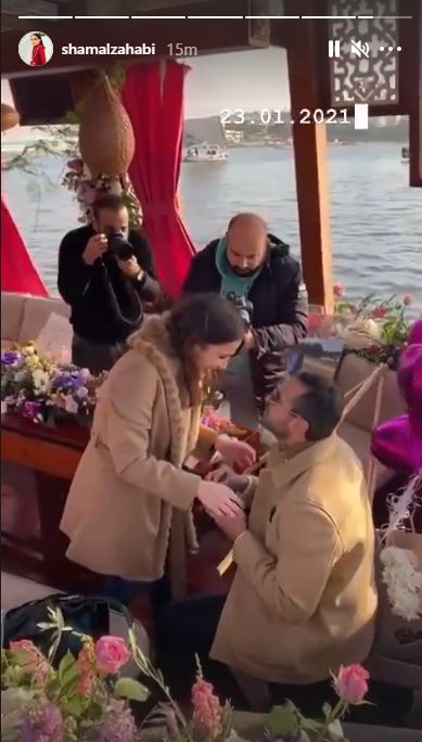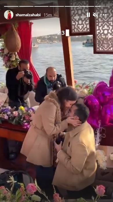 ونشرت شام الذهبي الفيديو عبر خاصية “استوري” حسابها الشخصي بموقع الصور والفيديوهات القصيرة “انستجرام”، حيث أقيم ذلك الحفل على أحد المراكب وسط النيل، وخلال الفيديو قام خطيبها بإهدائها خاتم الخطوبة، راكعًا على قدمه في مشهد مليء بالرومانسية.