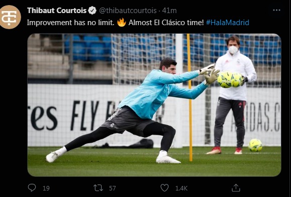 وكتب كورتوا، عبر حسابه الرسمي على موقع التواصل الاجتماعي تويتر: "التحسين ليس له حدود، حان موعد الكلاسيكو".