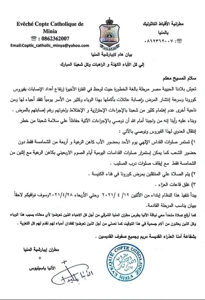 أعلنت مطرانية الأقباط الكاثوليك في المنيا، اليوم السبت، عن إتخاذ إجراءات وقرارات جديدة، لمواجهة انتشار فيروس كورونا المستجد، بعد ارتفاع حالات الإصابة خلال الفترة الأخيرة.