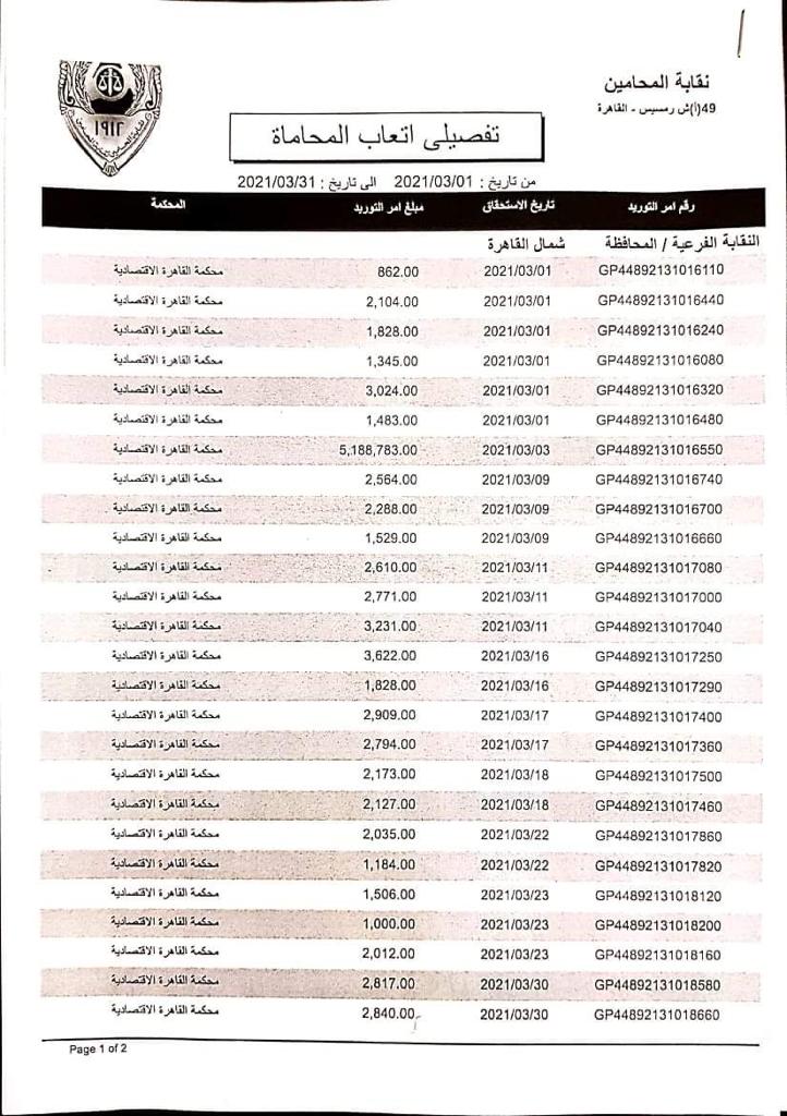 وتابع، أن المحكمة الٕاقتصادية وردت عن شهر مارس 5.234 مليون جنيه، ليبلغ المجموع نحو 166 مليون جنيه.