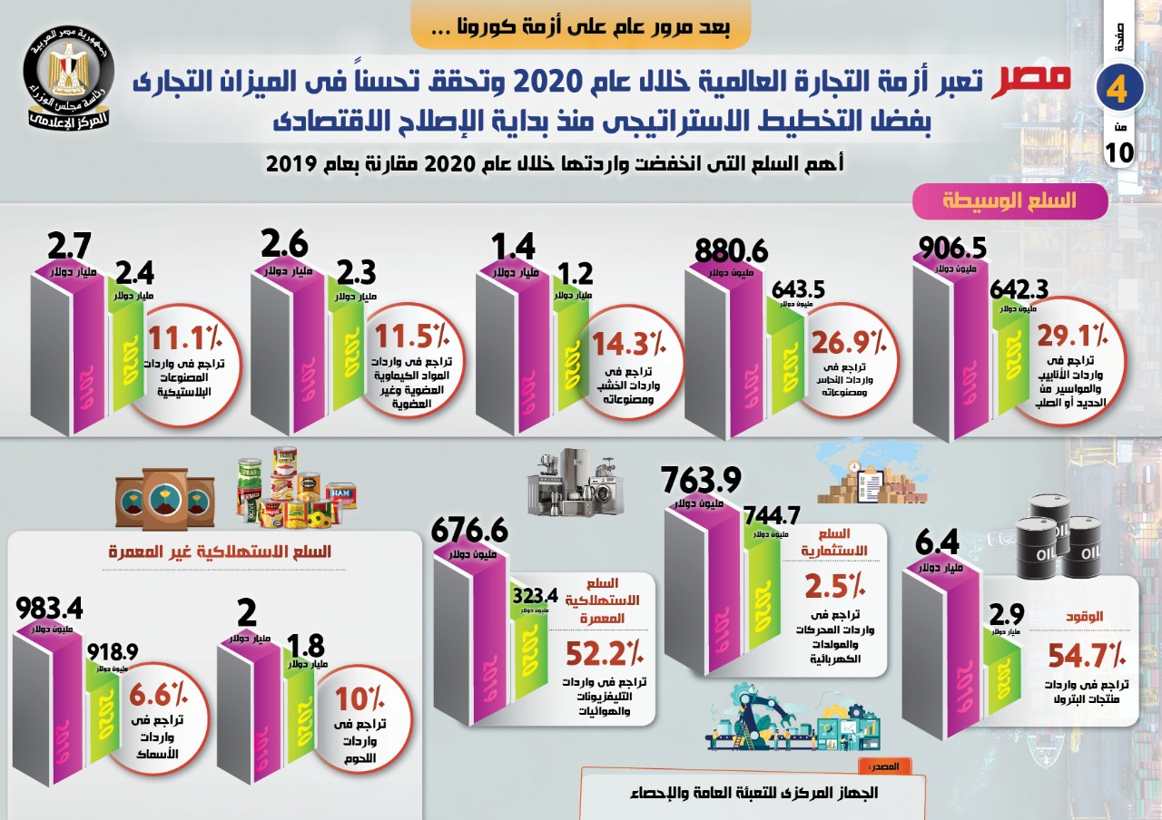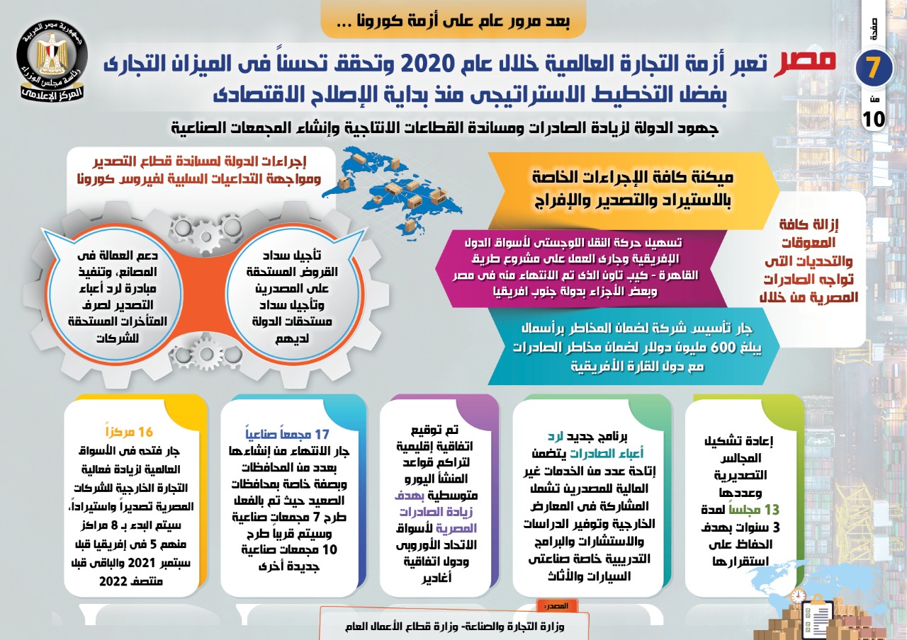 وفي هذا الصدد، نشر المركز الإعلامي لمجلس الوزراء، تقريراً تضمن إنفوجرافات تسلط الضوء على عبور مصر أزمة التجارة العالمية خلال عام 2020 وتحقيقها تحسناً في الميزان التجاري بفضل التخطيط الاستراتيجي منذ بداية الإصلاح الاقتصادي، وذلك بعد مرور عام على أزمة كورونا.