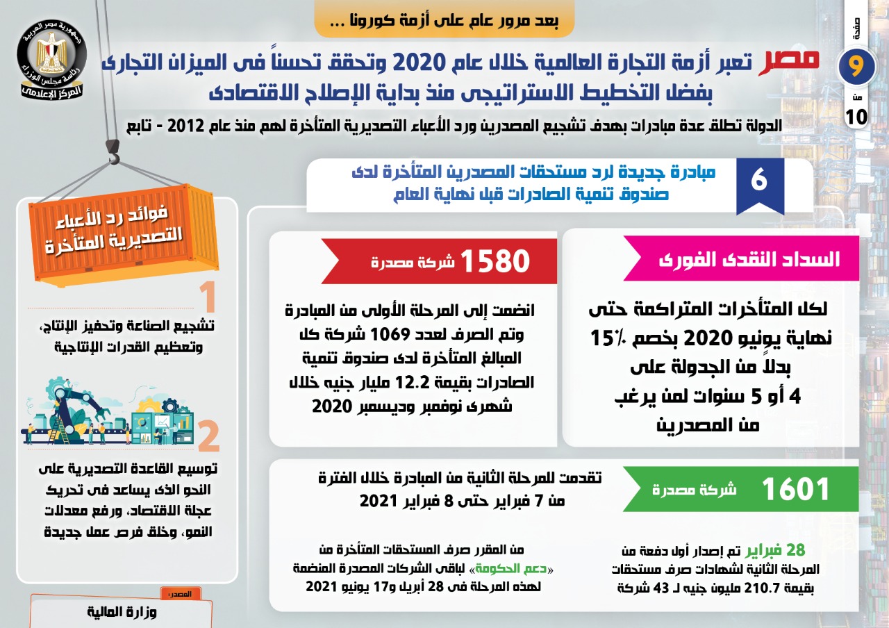 وذكر التقرير أن هناك 1580 شركة مصدرة انضمت إلى المرحلة الأولى من المبادرة السابق ذكرها وتم الصرف لعدد 1069 شركة كل المبالغ المتأخرة لدى صندوق تنمية الصادرات بقيمة 12.2 مليار جنيه خلال شهري نوفمبر وديسمبر 2020.