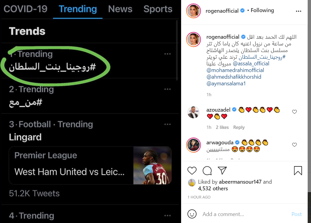 ونشرت روجينا، هاشتاج تتر المسلسل المتصدر تريند على “تويتر”، وذلك عبر صفحتها الشخصية بموقع الصور والفيديوهات القصيرة “انستجرام”، وعلقت قائلة: "اللهم لك الحمد بعد أقل من ساعة من نزول أغنية كان ياما كان تتر مسلسل بنت السلطان يتصدر الهاشتاج، روجينا، بنت السلطان، تريند على تويتر مبروك علينا".