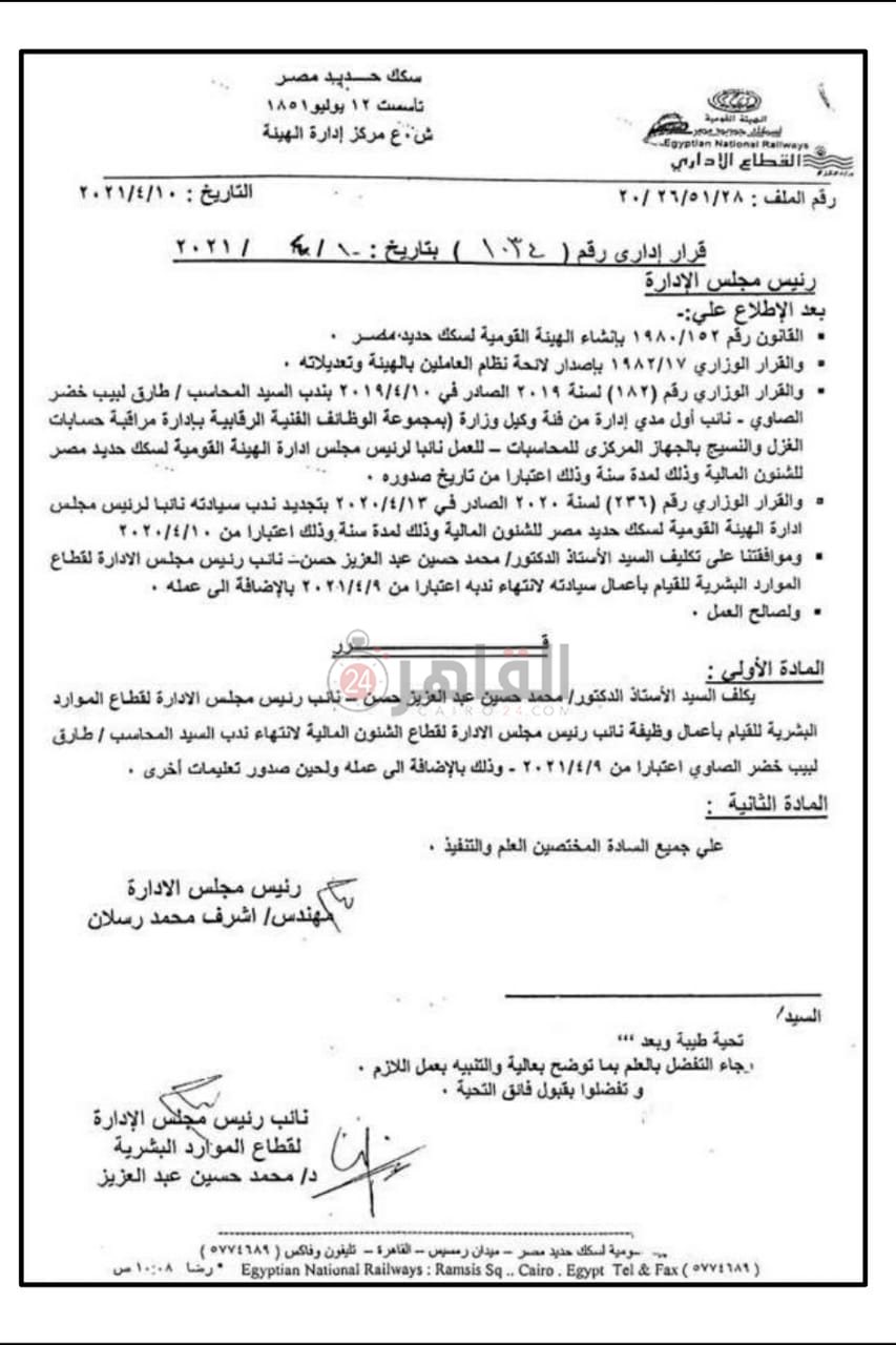 التجديد لمحمد حسين نائبا للموارد البشرية بالسكة الحديد مع توليه مهام القطاع المالي (مستند)