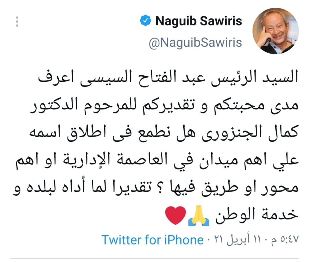 وقال ساويرس “السيد الرئيس عبد الفتاح السيسى أعرف مدى محبتكم و تقديركم للمرحوم الدكتور كمال الجنزورى ونطمع فى اطلاق اسمه على أهم ميدان في العاصمة الإدارية أو أهم محور أو طريق فيها؟ وذلك تقديرا لما أداه لبلده وخدمة الوطن".