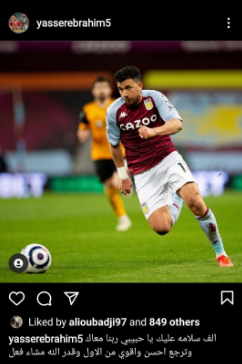 حرص ياسر ابراهيم، لاعب النادي الأهلي على دعم زميله محمود حسن تريزيجيه، لاعب أستون فيلا، وذلك بعد تعرضه للإصابة بقطع في الرباط الصليبي أمس، بمباراته أمام ليفربول.
