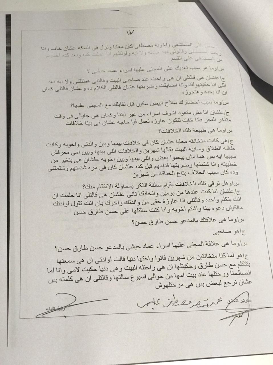 ج: اللي حصل إن في بينا خلافات من حوالي شهرين، وكانت سايبة البيت وواخدة ابني، وماكنتش بتتكلم معايا خالص، وكانت عايزة تتطلق وأنا مكنتش عايز أطلقها، وفي الفترة دي كانت متخانقة مع أختها “دنيا عماد حبشي”، وبعد كده عرفت من أختها دنيا إن هي بتكلم واحد صاحبي اسمه "حسن .ط .ح"، وهي كان في مشاكل بينها وبين والدتي وبينها وبين خطيبة أخويا، وأنا حبيت أصالحها وكانت دايما بتقولي عايزة تتطلق وكانت دايما تقولي عايزة حقها من أمي وأخويا، أقولها مالكيش دعوة بينا، واتفقنا إن إحنا نرجع لبعض، وقلت أحايلها وأقولها إن أنا موافق عشان تحل الموضوع.