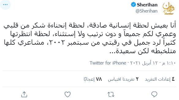 وكتبت شريهان تغريدة، عبر حسابها الرسمي بموقع التدوينات القصيرة "تويتر"، قائلةً: "أنا بعيش لحظة إنسانية صادقة، لحظة إنحناءة شكر من قلبي وعمري لكم جميعًا، ودون ترتيب ولا استثناء، لحظة انتظرتها كثيرًا لرد جميل في رقبتي من سبتمبر 2002، مشاعري كلها متلخبطة لكن سعيدة".